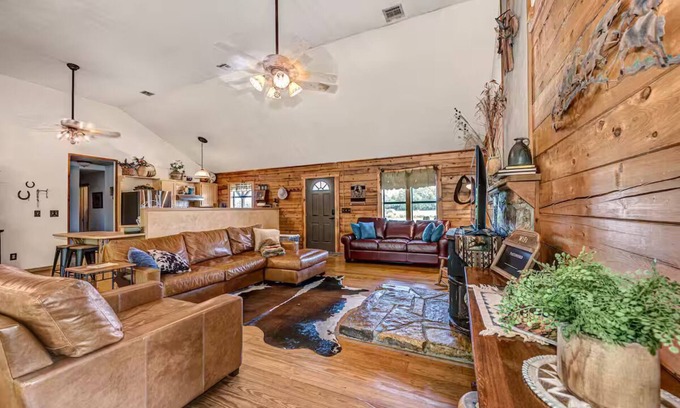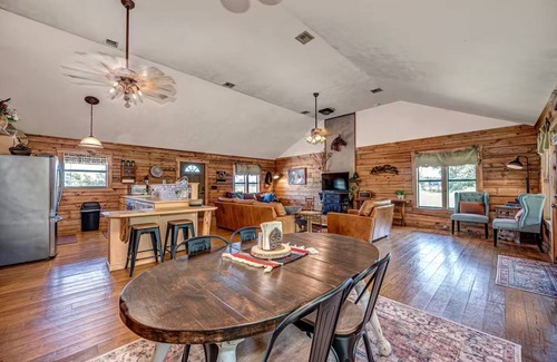 Spacious main area for dining and relaxing. Covered back porch the entire length of the Cabin. Master suite with soaking tub and walk-in Shower. Guest bedroom bed converts to King. Access to loft with spare beds and window unit.