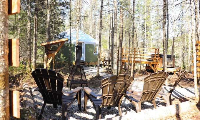 New signage since July 2023!!! In Saguenay, Exode en Nature offers accommodations facing a majestic river, surrounded by lush vegetation! Come relax and enjoy all the amenities offered by Myrica, a luxurious yurt in the heart of nature with a private wood-heated Nordic bath! Around the lodgings: hiking and outdoor activities, fishing, Tadoussac, kayaking and other water sports and much more!