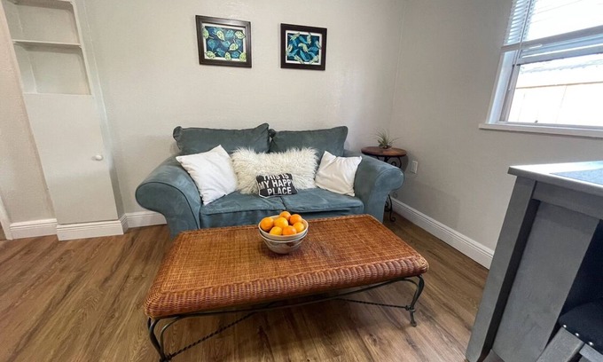 The cottage with a living room, bedroom, kitchen, and bath with a shower/bathtub is behind the main house in a quiet area under oak trees. Everything has been renovated and is kept up-to-date. If there's anything you need during your stay, please let us know, and we will be happy to accommodate.