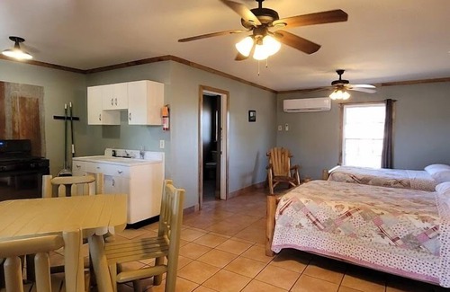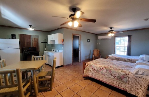 Discover the perfect blend of charm and simplicity in our small motel units, tailored for smaller families or couples seeking a peaceful escape. With room for up to 4 guests, these cozy accommodations include two full beds, a private bathroom, and a full kitchen (note: no microwave). Bedding and towels are not automatically included in this rental. If you would like to add these onto your reservation, please contact property ahead of time to make arrangements and check pricing. Pets require an additional $75 per pet, per stay and a refundable $300 security deposit that is refunded so long as everything is left in good condition.