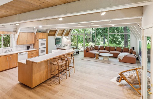 A Frame of Mind Mt Hood on the River is a bright and breathtaking riverfront cabin nestled in the trees right off the highway for easy snow access.
