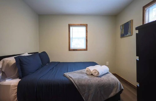 Bedroom 1 - Queen sized mattress with comfortable linens and 4 pillows. Closet with hangers provided. 2 bath towels provided on the bed. A basket of blankets can be found on the 6-drawer dresser.