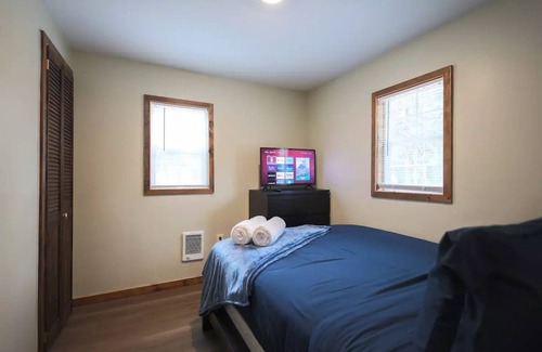 Bedroom 2 – Full sized mattress with comfortable linens and 4 pillows. 2 bath towels are provided on the bed. Linen closet with extra linens, an iron w/ board, and Tide pods in case you would like to utilize the laundromat down the street. Also features a Roku Smart TV on the 4-drawer dresser.