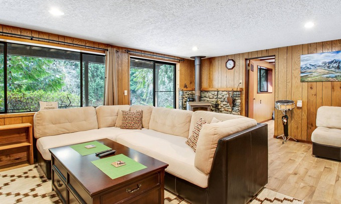 Beautifully situated in an evergreen grove on the high banks of the Stillaguamish River, this three-story riverfront cabin is a place to take in the beauty of Granite Falls. Enjoy a private beach down the back stairs, as well as a covered deck and patio where you can take in the view and listen to the river rushing by.