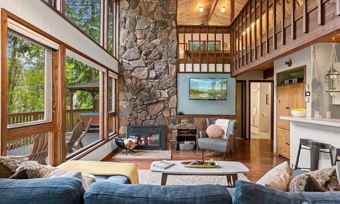 This riverfront cabin features large two story river view windows, vaulted ceilings, wood burning fireplace, a deck with hot tub + BBQ, a pool table, stocked kitchen, gig internet and a generator! Sleeping six guests comfortably, this cabin is ideal for all seasons: hiking, fishing, rafting, 30 min to skiing or snowboarding! Or just relax by the river.