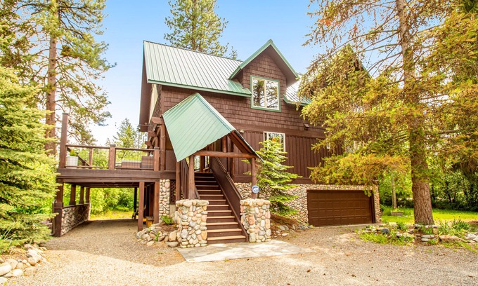 Inside, you’ll find all the comforts of home. Hardwood floors, pine-paneled walls, and a cozy woodstove enhance the cabin vibes, and the open layout makes gathering together easy. The chef will love the full, well-equipped kitchen, which features stainless steel appliances and plenty of prep space, and the gang can eat together at the large dining table. Spend the day exploring and then relax together in the living room in front of the woodstove, or head upstairs to the second living space.