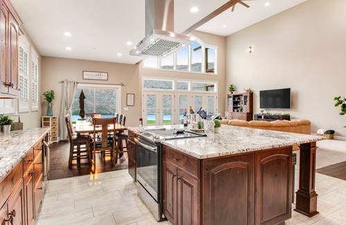 As soon as you step inside, you will feel right at home with a spacious interior, beautiful windows allowing natural light and river views from nearly every room, and a two-story layout ideal for larger groups to get some privacy. The main level will be the hub for entertaining with a wonderful full kitchen awaiting the group's chef to whip up tasty meals with ease using the stainless steel appliances, dishwasher for easy cleanup, wine fridge, and ample utensils. Everyone will love relaxing outside on the large patio to watch the river water pass by during the day, yet the main living area will be perfect for movie nights with comfortable furnishings and plenty of entertainment options with enhanced TV channels, YouTube TV, and a movie library. Two bedrooms and an office are also on this level.
