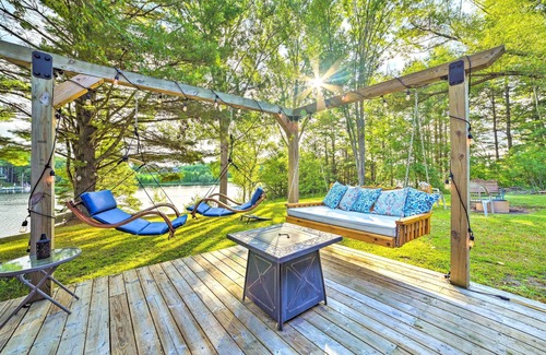 OUTDOOR LIVING: Boat dock, water access, spacious yard, cornhole, fire pit (firewood not provided), deck, patio furniture, gas grill, charcoal grill, porch swings, lounge chairs, beach towels