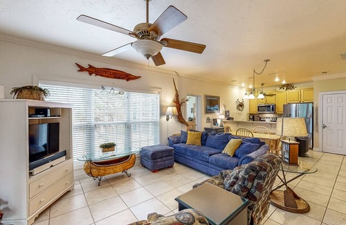 The home's open-concept living area is perfectly designed for family gatherings, with plush seating and a smart TV equipped for comfort and entertainment. The stainless steel full kitchen is ready and equipped for home cooking. Additional perks include central air-conditioning, free WiFi, and a private washer/dryer.