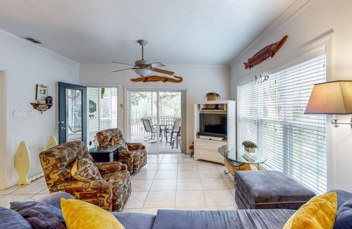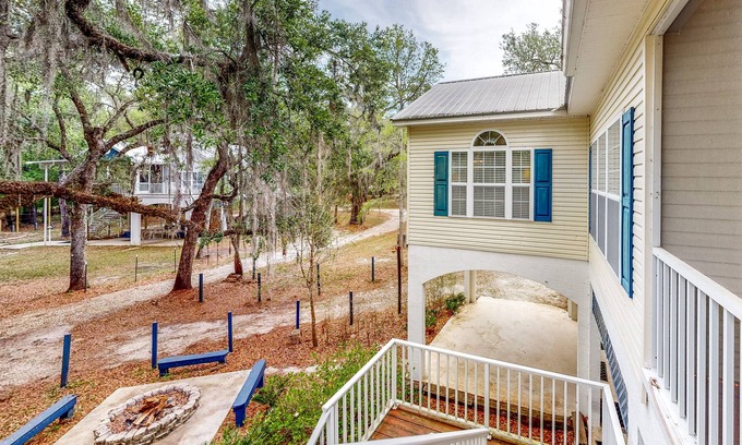 Get a true taste of Natural Florida way down on the Suwannee River at this leisurely riverfront retreat! Located just under 40 miles from Gainesville, this country charmer offers an inviting escape in a scenic, family-friendly setting. Whether you're just relaxing by the river or enjoying endless outdoor adventures, this home has you covered for whatever speed you choose. A private screened porch comes furnished to help you make the most of the outdoors, and a firepit is available out in the yard for those summer evening s'mores sessions. A boat ramp and communal dock with open slips shared between a few neighboring homes are yours to access during your stay. Additional neighborhood amenities include a swing set, tetherball, horseshoes, shuffleboard, and volleyball/basketball courts. Up to 12 kayaks can also be rented for an additional daily fee.