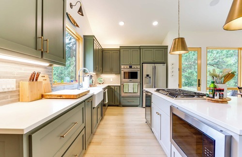 - Stovetop, double oven, refrigerator, dishwasher, wine cooler