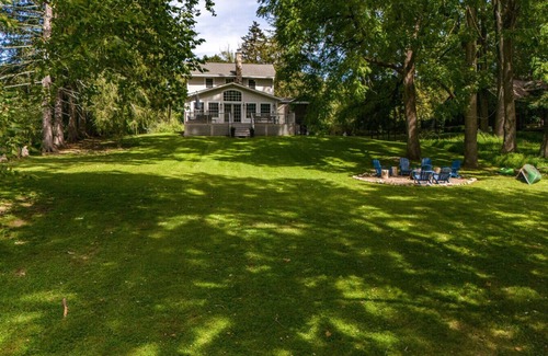Outside is just as special as the inside. Attached via a deck is a fully screened-in porch with dining table, a nearby BBQ grill, and peaceful river views. Down on the lawn is a large fire pit situated to maximize the river views, all from under the shade of a giant centuries old tree. Walking around to the front of the home, you and your guests can lounge in rocking chairs on the covered porch—the perfect spot to meet and greet the neighbors.