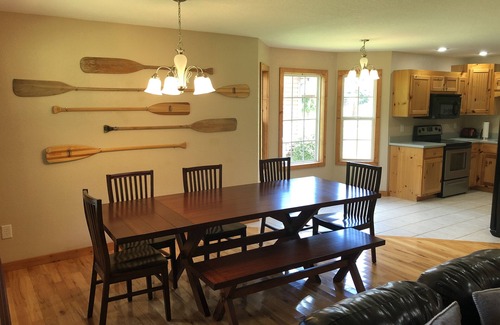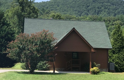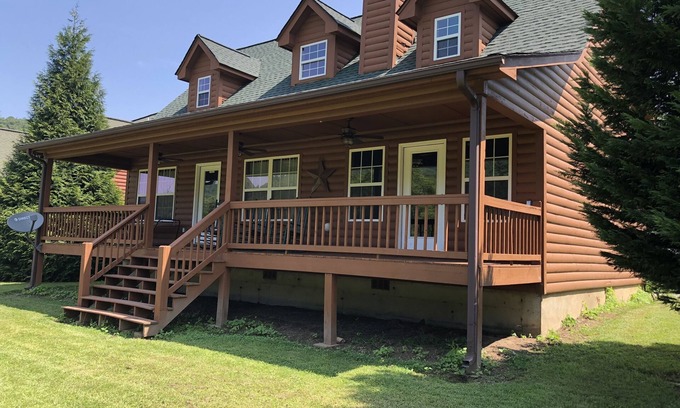 Riverfront Cabin with 360 degree Mountain Views and trophy trout fishing opportunities on over 2000’ of the Hiawassee River just a few yards from the back door. The property includes 15 acres of community green space for guests to spread out and use including riverside fire pits and picnic tables, walking trails and a community swimming pool with exercise facility.. Cabin features 3 bedrooms and 2.5 baths that sleeps 10 people - Main level Master bedroom features access to rear covered porch, a king size bed, 50 inch flat screen tv, double walk-in closets and ensuite bathroom with jetted tub, separate shower, and double vanities. Upstairs Bedroom 2 has 1 queen bed and bunk beds (2 twin beds) with a flat screen tv. Upstairs Bedroom 3 has 2 queen beds with a flat screen tv. Bedrooms 2 & 3 share a full size hall bath with shower. The cabin is equipped with a main level laundry room with full size washer and dryer and half bath, fully equipped kitchen for cooking and large dining room table. Open concept living room with wood burning fireplace and 50 inch flat screen tv and DVD player. The cabin features high speed internet and WIFI and DirecTV. Rear covered porch features rocking chairs, a hammock, charcoal grill & gas grill. New kitchen appliances, new blinds and new bedding. Enjoy your morning coffee and sunsets on the rear covered porch smelling the sweet mountain grass and mountain views!