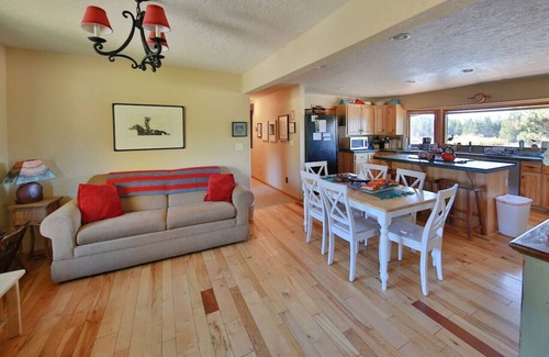 Discover tranquility at this expansive lodge in just outside Sunriver Resort. With 7 bedrooms, 11 beds, and a bunkhouse that adds beds for 6 more, it's perfect for families and large groups. Nestled by the Deschutes River with stunning mountain views, enjoy direct water access and outdoor activities. Ideal for relaxation and adventure alike.