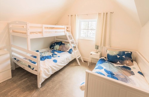 The second bedroom features a twin over double bunk bed and daybed which works either as a twin or queen bed. This bedroom features views of the ski hill.