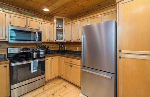 Guests will have the entire cabin to themselves with private riverfront access and the security of a gated community. This cabin has everything you need for a relaxing day grilling out on the deck with a front row seat for watching wildlife and soaking up the sunshine and view. Let the calming sound of the river relax you as you enjoy making s’mores at the fire pit. The private hot tub also creates the perfect setting for a treetop experience by day and stargazing under the night sky. The cabin also features a fully equipped game room for ping pong and billiards enthusiasts.