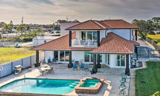 Looking for the best vacation rental on the Space Coast with unparalleled rocket launch views and ultimate luxury? Indulge in this exquisite 5,000 sq/ft Titusville estate - a haven tailored for grand living! This 9BR/7BA picturesque estate on the Indian River is perfect for family reunions and group get togethers. Embrace a lavish lifestyle with exclusive amenities - a pickle ball court, 10 flatscreen TV's, a gourmet kitchen, private infinity pool, soothing hot tub, and fishing dock!