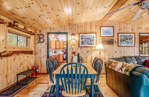 Plan your next boating or fishing getaway at this beautiful, riverfront cabin in Lac du Flambeau. Set on a quiet river that serves very few homes, this peaceful retreat features a gorgeous, open interior with knotty pine walls and ceilings, rustic, handcrafted furnishings, and plenty of desirable amenities to ensure the utmost comfort for you and your guests. Whip up everyone's favorite recipes in the well-equipped, full kitchen complete with a breakfast bar for casual dining. Gather around the table for six for mealtimes or family game nights, or indulge in an al fresco experience with a view from the screened, three-season porch. Close out your evenings by warming up in the glow of your wood stove while you relax.
