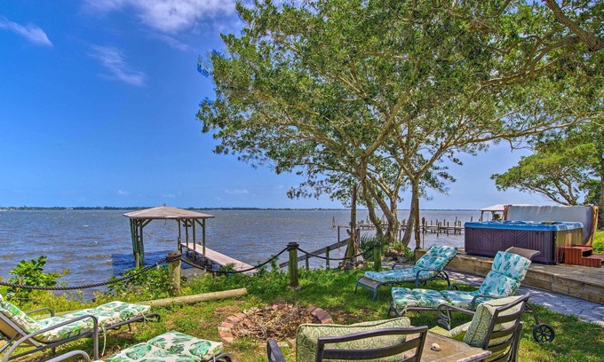 Attain great heights from this 2nd-story getaway with a courtyard full of goodies and a sparkling river alongside it. Not only can you watch dolphins, birds, and rocket launches, but you can also use the hot tub, fire pit, boat dock, tiki bar, or dining table while all the action occurs. Minutes from beaches, scenic parks, and piers, this vacation rental has no shortage of activities to partake in. Best of all, the Smart TV and deck will help you relax with a loved one when it’s time to retire.