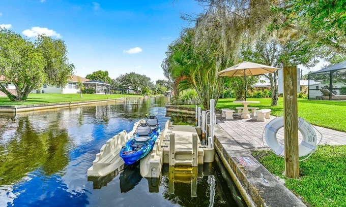 This beautiful Modern Décor has a caged pool, outside bar, boat/kayak dock to launch the one tandem and 2 single kayaks which are included in this rental home. Located in a Country setting and family oriented neighborhood with ancient oaks, bamboo, gardenia and banana trees are present.