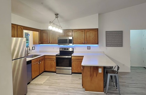 Inside, the spacious living area features a large sectional sofa and widescreen Roku TV, perfect for movie nights after a day of exploring. All three bedrooms are outfitted with crisp linens, and the bathrooms are stocked with plush white towels and essential amenities to make your stay comfortable.