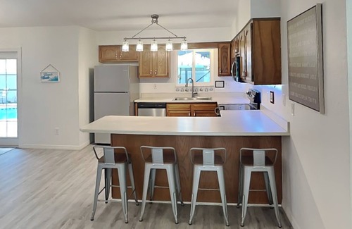 This thoughtfully furnished vacation home combines coastal charm with comfort and convenience, featuring a private screened heated pool, a spacious patio with multiple dining and lounge areas, and a fully equipped kitchen perfect for family meals. The open-concept layout provides plenty of room to relax and connect, whether you’re gathered around the indoor dining table with pool views or enjoying a quiet morning coffee by the pool.
