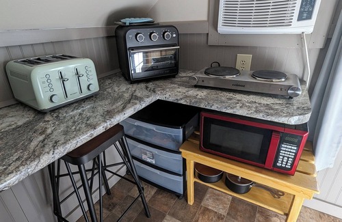 Upon entering, you'll find a full bathroom to the right of the front door, ensuring convenience and comfort. Straight ahead, a staircase leads you to the upper level, where the studio awaits. The loft boasts a small but well-equipped kitchen with a 2-burner electric range, toaster/convection oven, coffee maker, and all the tools needed for cooking and serving up delicious meals.