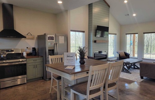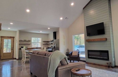 Book your relaxing private getaway in this beautiful new build! This cabin seated on the river offers beautiful nature views through picture windows around the fireplace. Sleeping available for up to 6 guests, with 2 queens bedrooms and a queen sleeper sofa in the living room. Extra amenities include a smart tv, wifi, white noise machines to ensure a soothing nights sleep, keurig coffee maker, books, games, and all the basics for cooking a meal while you make yourself at home. A pack n play with mattress, and plastic dishes are included as well to provide a family friendly stay for the little ones.