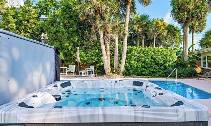 The pool deck boasts a huge back yard with a large non-heated swimming pool and a hot tub as well outdoor furniture perfect for relaxing in the Florida sun after coming back from the beach. In the front of the home is some Adirondack chairs facing the river where you can watch the sunset as dolphins swim through the Intracoastal.