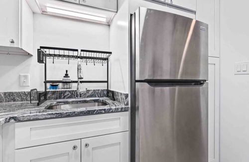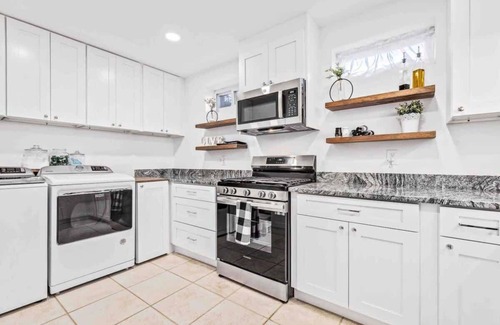 Continuing down the hallway, you’ll find two comfortable Queen bedrooms. One of the Queen bedrooms features two Queen beds, making it a great option for those traveling with family or friends. The other bedroom offers a peaceful retreat with a single Queen bed. The bathroom is conveniently located down the hall, separate from the bedrooms. The fully equipped kitchen also features a washer and dryer, adding extra convenience for longer stays.