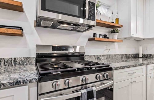 As you step into the in-law suite, you’ll be welcomed by a bright and inviting open-concept living and dining area. The spacious living room features a large white sectional, perfectly positioned next to a cozy pellet stove, with a TV mounted above—making it the ideal spot for relaxing evenings with a glass of wine. This area is designed for everyone to gather and unwind together. Just to the left of the front door, you’ll find a little sitting nook with a sliding closet, perfect for taking off coats and shoes. Nearby, a table is stocked with complimentary snacks, water bottles, and our welcome guide—a thoughtful touch from the homeowner to help you settle in and get acquainted with the area.