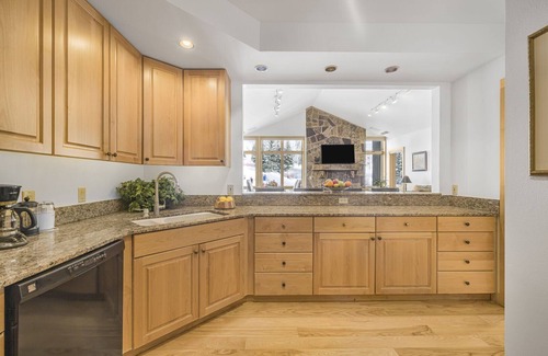 This single level condo features 1800 sq. ft. of living space including 2 bedrooms, large walk in closets, spacious living room, large kitchen and 2 1/2 baths. The unit is beautifully decorated and offers an open floor plan for the gourmet kitchen, dining and living room areas that features high vaulted ceilings with a stone fireplace and a heated deck with BBQ and a million-dollar view. The living area boasts plenty of room to lounge around and recover from the days adventures while the expansive, well appointed kitchen with granite countertops and a breakfast bar that seats 4 provides the perfect space for preparing your favorite culinary masterpieces. The master bedroom has a king bed, TV/DVD and ensuite bath with a Jacuzzi tub and walk-in shower. The second bedroom offers two twin beds, which can be converted to a king for a fee, with private bath. The property also has a single Rollaway Bed for a fifth guest. A half bath and a laundry room round out the amenities for Cody D and are located off the living room in the hallway.