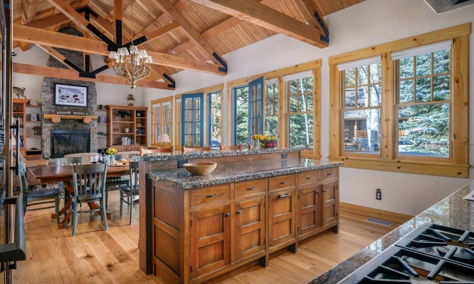 Situated less than a 5-minute walk to the slopes, this home is a skier's dream and a summer adventurer's paradise. The open-concept main level boasts custom furnishings and a warm, inviting atmosphere anchored by a grand stone fireplace. Enjoy a cozy evening in the living room, or gather around the dining area, which seats 8, with an additional granite breakfast bar for 4. The gourmet kitchen is a chef's delight, featuring high-end appliances and everything you need to whip up a hearty meal after a day of adventure.