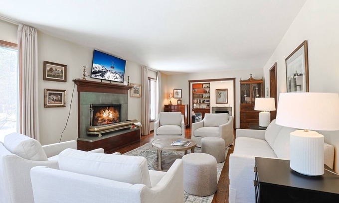 Step inside, and you'll immediately feel at home. To the right, the spacious living room beckons with a cozy wood-burning fireplace and a 50-inch TV, perfect for streaming your favorite shows while enjoying the warmth of the fire. Adjacent to this space, a private sitting room with its own wood-burning fireplace offers a peaceful retreat, ideal for splitting up the group—let the kids enjoy their own movie on one TV while adults relax in a more tranquil setting.