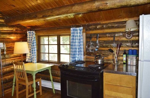 The master bedroom is located on the original side of the cabin with rustic wood floors and exposed log beams with a private outdoor access from the master bedroom. Charming paned windows allow for natural light to fill the room. The second sleeping area located in the newer part of the building is a lofted space, accessed by wooden stairs in the living room and offers two twin beds. Guests should note that this stair access is steep and consider the safety of people accessing.