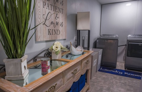 The 1st room has a full size bed, full futon, Smart TV, a three drawer dresser, and portable heater. 2nd room has a King bed, small collapsible 4 drawers storage unit, Smart TV, nightstands and bench. Full kitchen, modern bathroom with spa panel and a very large living room with lots of comfortable seating areas. We also have a roll away bed which would need to be requested. The laundry room is a shared area and the only area we will enter during your stay. We welcome you to use the washer and dryer however we ask you check your pockets for paper, tissue, coins, money and pens.