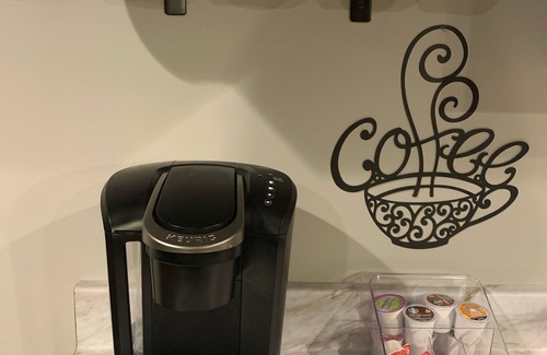The kitchen is fully equipped with stainless steel fridge, microwave, electric stove top, oven, dishwasher, Keurig coffee maker, regular coffee pot, Ninja blender, air fryer, pots & pans and all cooking utensils.