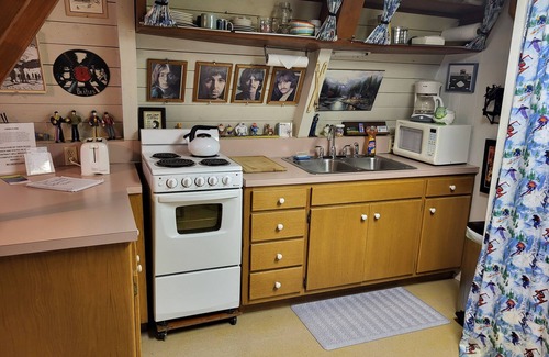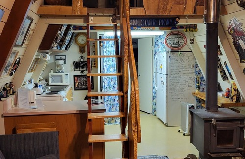 This cabin offers a full kitchen, washer / dryer, wood stove and electric heat, BBQ, cable T.V. , wifi, and outdoor firepit. It sleeps 4, there is a queen bed upstairs and a full bed downstairs.