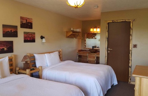 The beautiful and spacious three-story pine lodge engulfs you in western atmosphere. There are 37 guest rooms in the main lodge, and an additional 4 rooms in the nearby Arena Cabin. Our guest rooms are simple, yet comfortable, and all have private bathrooms with showers; and some have a tub and shower combo. Bed linens are provided; you will need to bring your own towels. The base rate includes 12 "inside lodge" guest rooms (3 rooms with one queen bed, 6 rooms with two queen or double beds, and 3 rooms with 1 queen, 1 double, and 1 twin bed--sleeping up to 45 people. Additional rooms--sleeping from 2 to 7 people each--can be added for an extra cost. (Please see the Room Descriptions for more information on the added cost.) In the Lodge there are a total of 77 beds that can sleep up to 142 people. The 4 Arena Cabin rooms each have 6 beds sleeping up to 7 people, for a total sleeping capacity of 170 people at the Rockin' R Ranch. If your group uses all of the rooms, camping in tents on the property will be allowed. If you need more than the 12 rooms included in the basic rate, please message the Ranch Host when you request your reservation to discuss the size of your group and the specific type of rooms you’d like to add. The number of guests in your group cannot exceed the number that can comfortably sleep in the beds of the rooms you have reserved. Guests cannot sleep in areas of the lodge outside of the bedrooms.