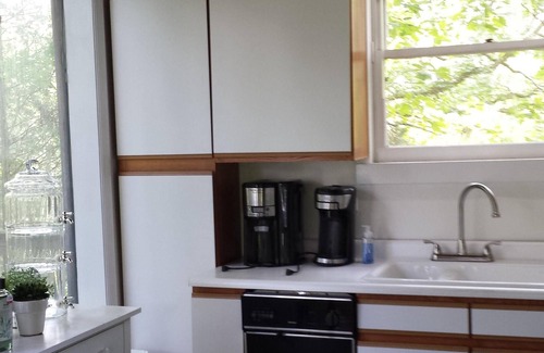 Sunsets rival those at the Beach and stargazing is excellent! Large second story bedroom with a sitting area looks out on forest. The bedroom is like a tree house. Sleep surrounded by trees. Cabin has a fully equipped kitchen and central heat and air. Laundry on site.