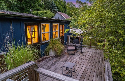 The Dogwood Suite has a private entrance with access to a large shared deck with table and chairs, overlooking The Rockwell grounds. The suite is newly updated with finished concrete floors, a luxurious modern bathroom, and luxury linens. This spacious suite includes an ultra HD smart TV, in-room climate control, sleeper sofa, and dining area with mini fridge, Keurig, and microwave. Please note, we do not provide plates and utensils.