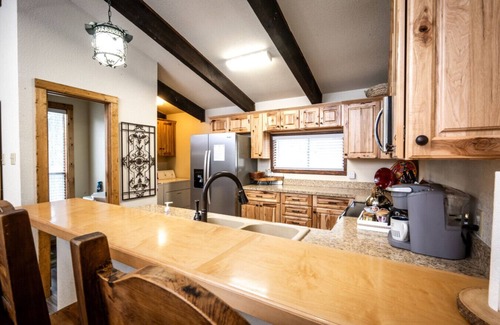 Entry Level you'll find your first 3 bedrooms - 2 rooms with King sized beds and the bunk room. You'll also find the first bathroom, a Jack and Jill style that connects the entry way all the way to the Master. Explore a little farther and you'll head downstairs where a cozy living area greets you with a fireplace, game room and extra bed. The 4th bedroom is located downstairs with the Queen bed as well as another full bathroom. Once you've found all of the bedrooms, head all the way back upstairs to find the kitchen, living and dining area. There is also a washer and dryer unit for your convenience.