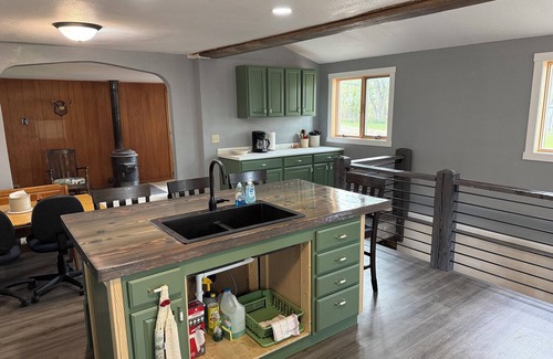 Our spacious farmhouse comfortably sleeps up to 8 guests with flexible sleeping arrangements. The master bedroom on the main floor features a queen bed with views of the rolling hills, while two upstairs bedrooms each offer comfortable queen beds for additional guests. For extra flexibility, the living room includes a unique bunk bed setup with a double mattress below and twin above. The recently renovated full bathroom provides a shower and all essential amenities for your stay.