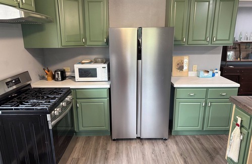 The heart of the home features a newly remodeled kitchen with brand new appliances and a matching kitchen island, perfect for preparing meals. Year-round comfort is ensured with our new AC and heating system controlled by an Ecobee smart thermostat. The beautiful four-season porch provides a relaxing space and houses commercial washer and dryer for guest convenience. The spacious living area invites you to unwind on our sectional sofa with chaise or settle into one of three comfortable lazy boy chairs, while the dining area offers the perfect spot to gather for meals with views of the expansive countryside.