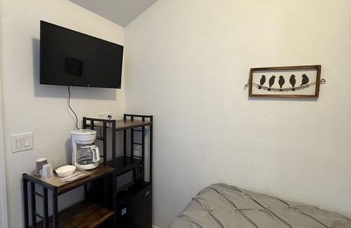 Come enjoy nature with our single bed motel style room with a full bathroom, right off the Rogue River. Discover the gorgeous landscape that surrounds this resort that is nestled between the mountains and the ocean. This room comes complete with its own private entry, a queen bed, smart tv, Wi-Fi, mini fridge, coffee maker with coffee, and a microwave. You can see the Rogue River from your front deck.