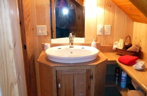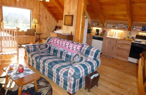 Our lovely cabin amenities include: A covered post and beam front porch down stairs, large post and beam deck with great views in all directions upstairs, English stained glass, cedar accents, old style yellow pine floors, a Jacuzzi tub for two, central air conditioning, a stainless steel outdoor gas grill ,we supply the gas.