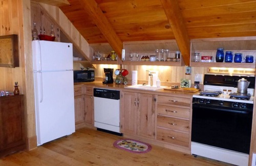 The Cabin is nestled amid forest and meadows, on a bubbling creek just off the two covered porches and is the perfect getaway destination. It is built in the 1800's fashion, with large posts and beams, high ceilings, all the wood is hand draw-knifed, the period style yellow pine floor shows the saw marks and is set by cut nails from a forge built in 1797.