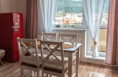 The spacious studio apartment is divided into night and day areas. After an active day, relax in the living area with a sofa and TV, or treat yourself to a coffee and relax while sitting outside with a beautiful view of Veľký Choč. The couch can be laid out to sleep 2 people. There is a kitchenette with a gas hob, microwave, kettle, fridge-freezer, coffee maker, dining area and kitchenware.