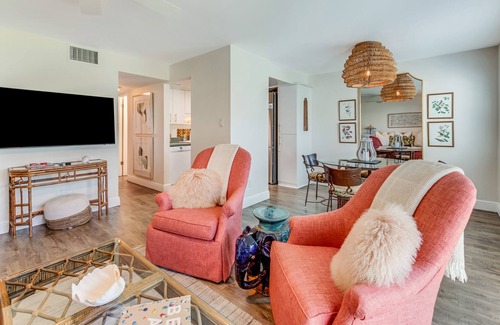 Kick back and relax in this calm, stylish space. This 1-bedroom beach condo hosts a beautiful living and dining space with incredible beach views. You'll find a fully equipped kitchen and a beautifully remodeled bathroom with a walk-in shower. The bedroom is wonderfully decorated with a very comfortable king size bed and a large walk-in closet. Enjoy the outdoors on your private patio with ocean views or hang by the pool. You'll also have direct beach access during your stay! Parking is provided for up to 2-vehicles. Outside of the condo and the beach, there's tons of great local restaurants and shopping just minutes away! Flagler Ave is notable area of a town with great shopping, night-life, and fantastic places to eat. Historic Canal St. is also just a quick drive away where you'll find more shops and restaurants, plus an amazing art scene!