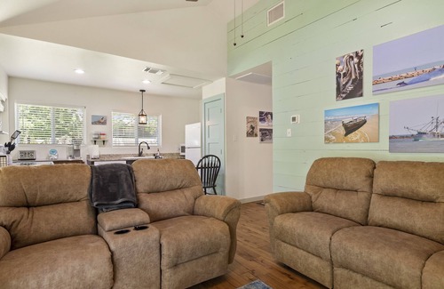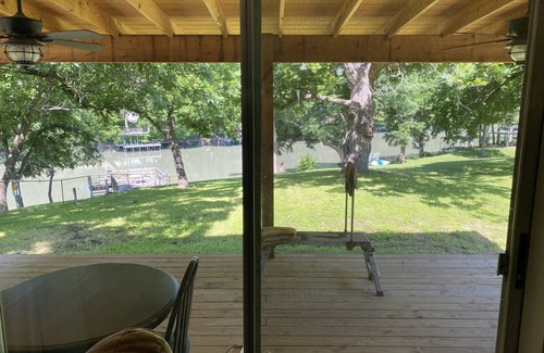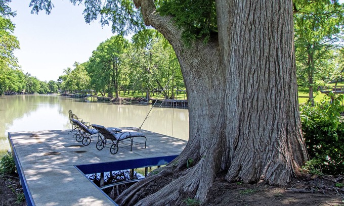 Come sit on the 400 SF dock of our Sliver Of The River on Lake Placid in Mcqueeney Texas! Fish or Kayak (river is low (no jumping off of dock) for dam repairs but we have added a ladder for access to swim and cleared vegetation so there is kayak access under the dock) or just snooze in the hammock. Large park like yard for kids/dogs to run around. (No fence though.) Up to 2 dogs under 50 pounds are allowed, must be listed and deposit paid. We have the cabin deep cleaned after each pet stay. Have dinner with a beautiful view of the river from the picnic table after you cook on the charcoal BBQ pit.
